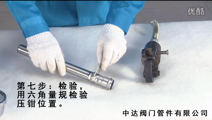 第七個(gè)步驟,完成壓接之后,那好后一步,就是拿六角量規(guī)進(jìn)行檢驗(yàn),卡壓后應(yīng)用專用六角量規(guī)檢驗(yàn)卡壓連接是否完好。整個(gè)管件安裝完畢后應(yīng)該對(duì)整個(gè)水管系統(tǒng)進(jìn)行試壓。